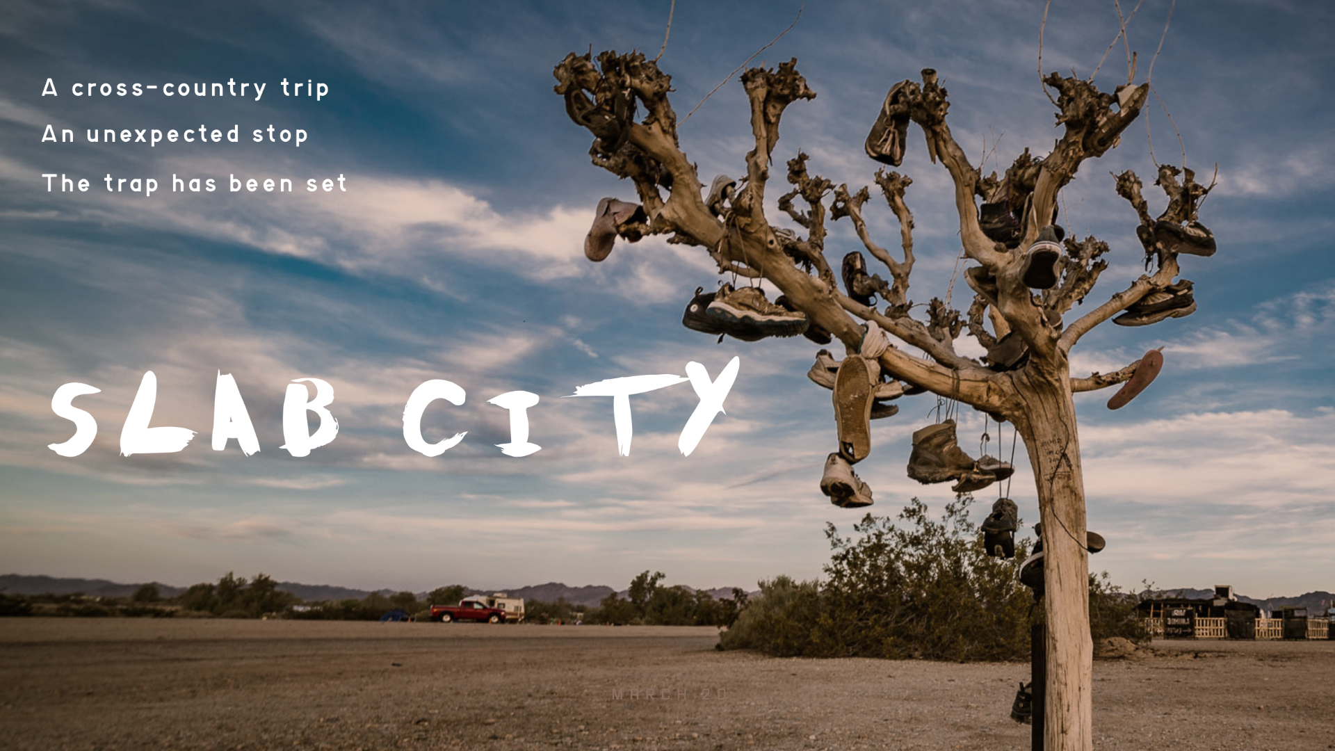 A desperate husband hacks his way through the last lawless place in America-SLAB CITY-as he hunts down his pregnant wife who vanished in the off-grid squatter community located in the Sonoran Desert.